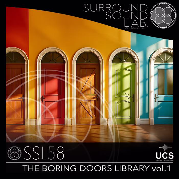 'SSL58 The Boring Doors Library' by Foley Collection & Surround Sound LAB features 80 detailed door sounds, including opens, closes, and creaks, captured in high-definition (96 kHz, 24-bit) over two years with both mastered and raw versions.