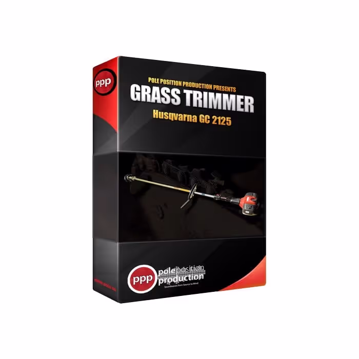 'Grass Trimmer' by Pole Position Production features a Jonsered GC 2125 grass trimmer with a 2-stroke engine. It includes performances of idles, revs, blips, ramps, steady RPMs, and working from nearby and distant perspectives. Plus get Pro Tools and Reaper mix sessions!