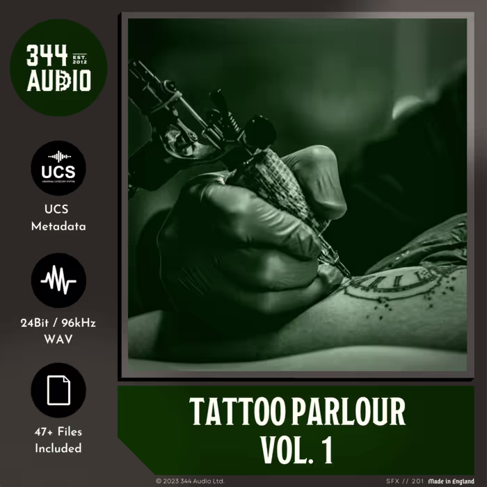 'Tattoo Parlour Vol. 1' by 344 Audio captures an artistโs unique tattoo studio. This is the only in-depth tattoo studio library available online, featuring a variety of hums, buzzes, and handling sounds created using both modern electromagnetic tattoo pens and vintage coil machines.