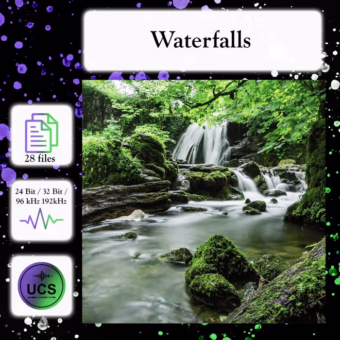 'WaterFalls' by Celine Woodburn has cascading waters of various streams and waterfalls, including the mighty Niagara Falls recorded at the cave of the winds! The recordings come in 192kHz 32-bit float from a Zoom F3 and exported in 192/32 and 96/24.