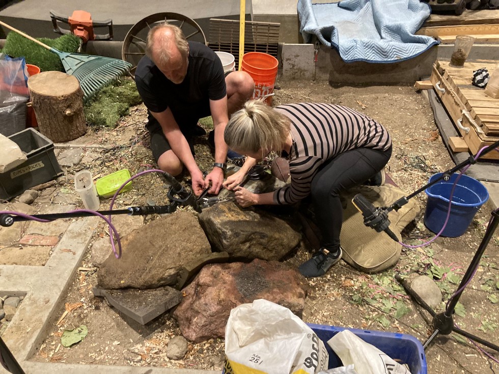 The same design language was largely used for ice climbing, making it more intuitive for the player. We used pickaxes and spikes on a giant ice block, as well as alternative props, including large pinecones that Heikki had brought from Finland. He has a special trick for creating ice sounds by crushing the cones against glass.