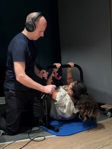 Instead, Camille Constantin Da Silva, the performer, would do intense exercise, such as high knees, after which we recorded her breathing for a minute while she caught her breath. A sequence like that can be edited into several groups representing different stamina levels. To capture different nuances, for example, representing different stamina orientations, Camille would put herself in different positions. Catching her breath while standing normally sounds very different from doing so while holding a plank position. Exhausted from the session, Camille would sometimes need a short nap, and we took the opportunity to record that as well for when Aava sleeps in her bivouac.