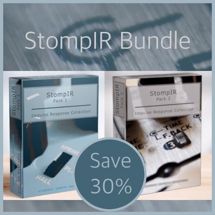 'StompIR Bundle' by Visionary Robots Industries contains 'StompIR Pack 1' and 'StompIR Pack 2'. These IRs were made with guitar pedals and reverbs like Skysurfer Spring King Tri Reverb Holy Grail NANO, Marshall Reflector, and more!
