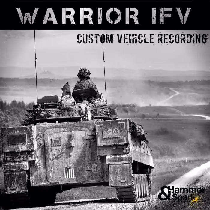 ย 'Warrior Infantry Fighting Vehicle' is a specialized library like no other. This collection by Hammer & Spark Audio Production features an Infantry Fighting Vehicle complete with all its intimidating bells and whistles. Sounds include turret movements, hatch operations, onboard switches, hydraulics, and plenty of engine sounds as the vehicle starts up, idles, and crushes the various terrain below it. With over 150 files and four hours of content, you can easily flesh out this fighting machine in your film or game, whether to simulate modern combat or protect the multiverse. For the unmistakable sounds of a military IFV, look no further.