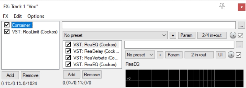 When adding an FX container, you can give it any number of inputs, theoretically allowing for near infinite parallel processing options within a single FX chain component. In the picture below, you see the track’s FX chain window with the Container plug-in selected. This will bring up a second FX chain to the right of the track’s FX list, showing all the plug-ins contained within the Container.