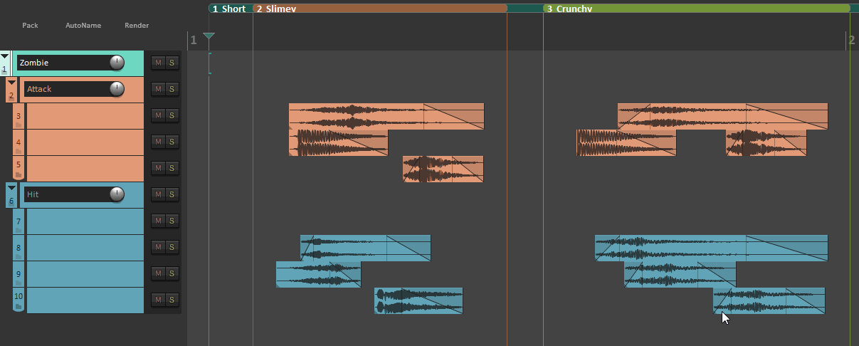 In the process, you design “Attack” and “Hit” sounds for a “Short” attack that can either be “Slimey” or “Crunchy”. For organizational purposes, you create a “Short” region to house everything, denoting that both attacks fall into that category; then, you create “Slimey” and “Crunchy” regions within it to make the two attack types easy to find once your project grows.