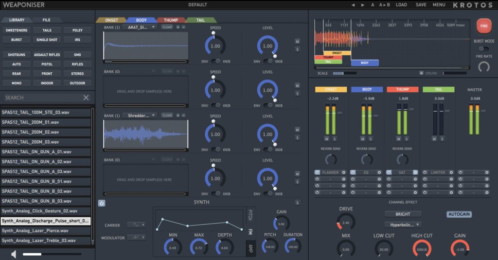 There are lots of different approaches to designing and recording weapons, so we discussed this in detail and aimed to produce a library with a range of weapons, mic positions and flavours. We wanted to provide a range of weapons straight out of the box, so it was important to have a stock of shotguns, pistols, rifle and automatics. We did a lot of research and conducted interviews with top recordists and sound designers to get a clear idea of the type and range of assets we would need to include. We also got creative with our own sessions of Foley (including objects like locks, machinery and other useful things) and our own collection of analog synths. We also produced a large cache of more abstract sounds to stimulate peopleโs creativity. The drum samples add a lot to a design as well, and can be used for programming beats, which Weaponiser also does very well.